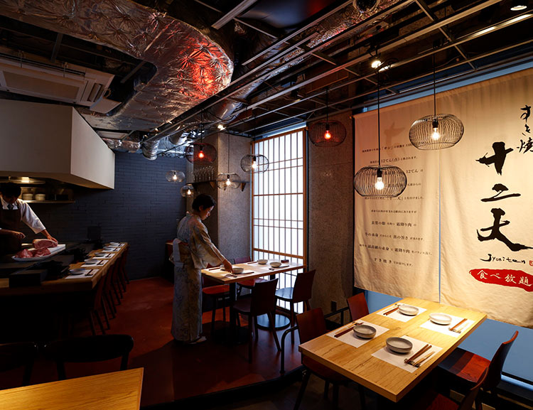 日本全国A5ランク十二等級の和牛を、産地やブランド、部位ごとに、とろける食感や旨味の食べ比べにてお楽しみいただける「すき焼き十二天」。和牛の最高級の赤身と霜降り肉をバランス良く使用し、すき焼きだけでなく、しゃぶしゃぶ、オイル焼き、ビフテキなど、主に4つの調理方法で和牛を堪能できる専門店です。店名である「十二天」は最高の神物であるお肉と向き合うと言う意味が込められています。お好みに合わせた「十二天」でしか味わえないWAGYUをお楽しみください。